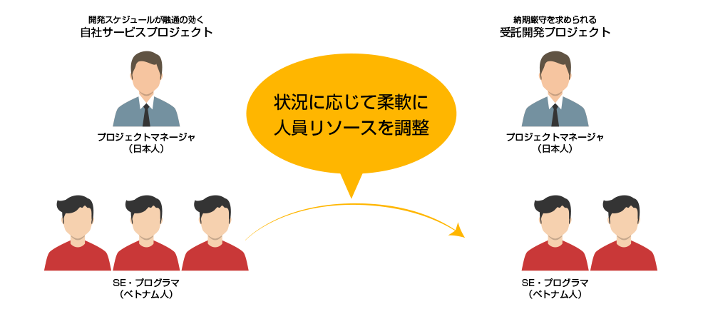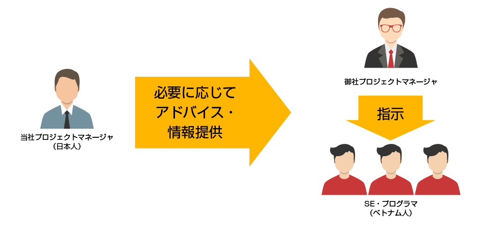 御社に経験豊富なプロジェクトマネージャーがいらっしゃる場合は、当社のプロジェクトマネージャーを介さずに直接ベトナム人スタッフにご指示いただくことで、コストを大幅に削減できます。この場合でも、ベトナム人スタッフのスキル特性や開発ツール・プロジェクト管理ツールなどを当社のプロジェクトマネージャーがアドバイス。始めてのオフショア開発でも安全に進行していただけます。