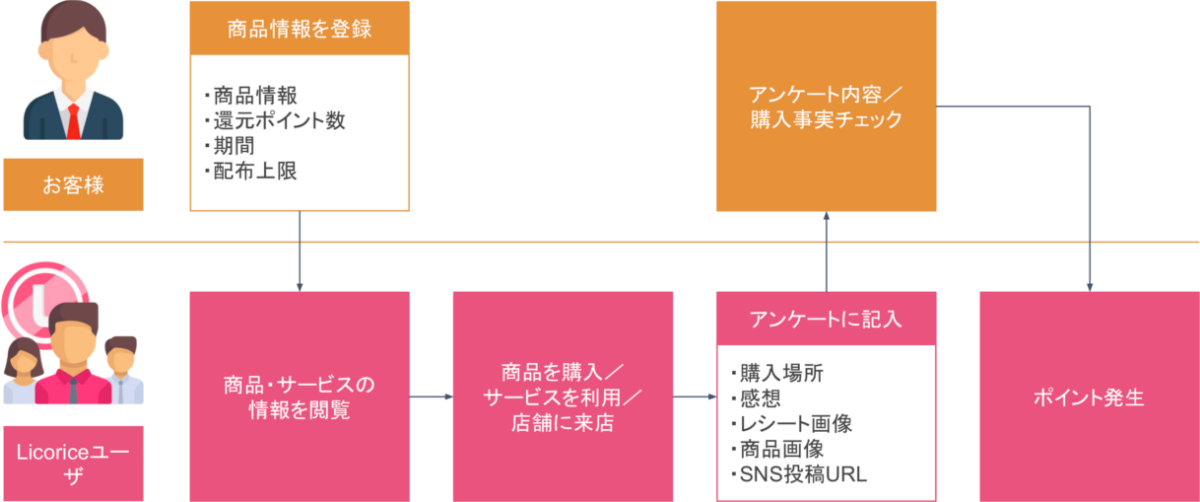 成果報酬型プロモーションと顧客満足度調査が同時にできるキャンペーンです。 Licoriceユーザは商品・サービス(店舗含む)への感想や評価、レシート画像、商品画像、SNS投稿(オプション)を入力することでポイント付与されます。